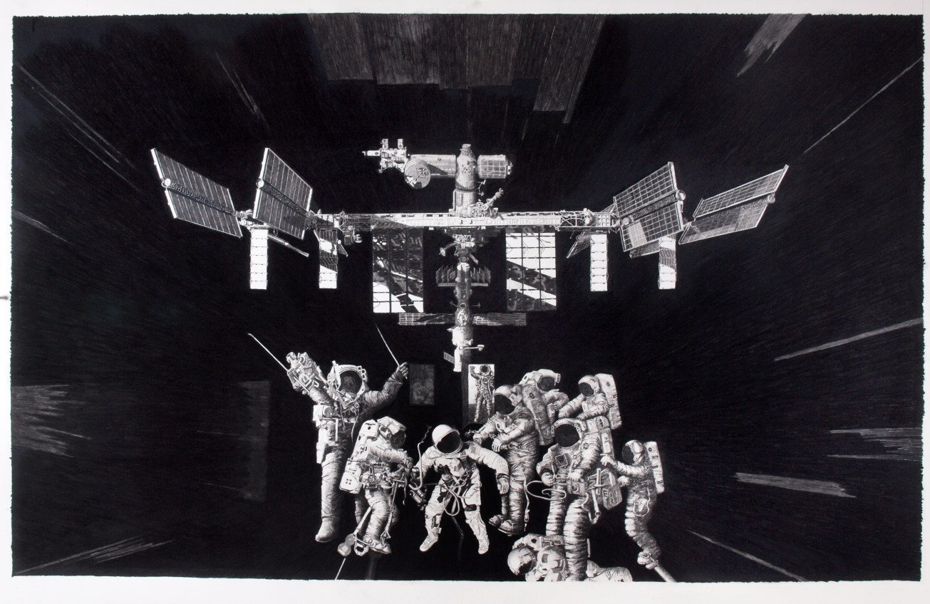 This one is kind of out there. When in Barcelona at the Miro Museum, we saw an exhibition of artists that had created their version of Velasquez’ classic painting, Las Meninas. Picasso and Dali also had their take on this painting, as well as others. There have also been many academic studies of this composition, analyzing the geometry, angles and alignments of the various characters, the room, and the doorway. So at the same time I’m thinking about drawing the bold and classic “façade” of the ISS, as it had been on my mind as architectural subject matter. It is quite a structure and place. Through the placement of the various characters that make up his painting, Velasquez captured the goings-on within that royal family. I started thinking about how we never hear anything about the personal dynamics that must go on inside the ISS, so added the space people using the same composition.